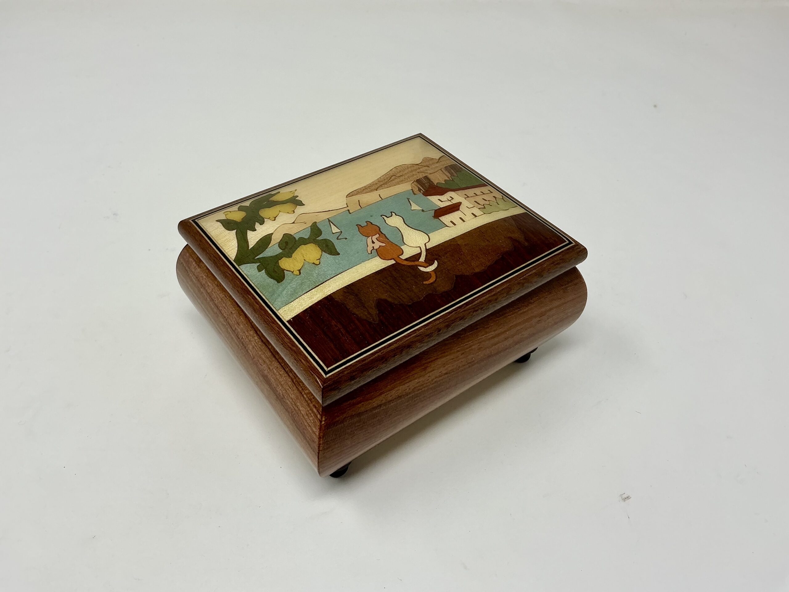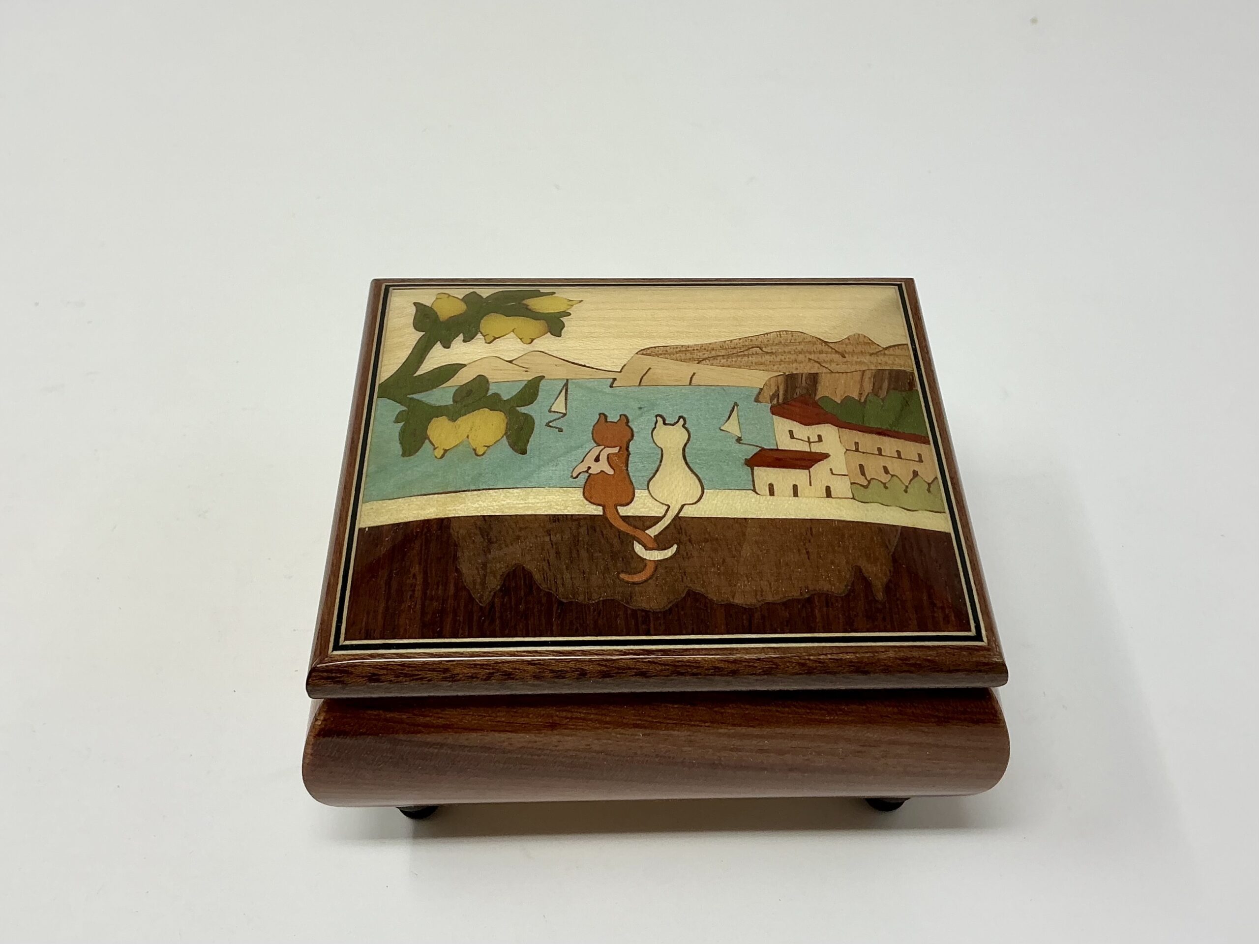 Presenta un bellissimo intarsio raffigurante due gattini con la meravigliosa città di Sorrento ed il Vesuvio sullo sfondo.