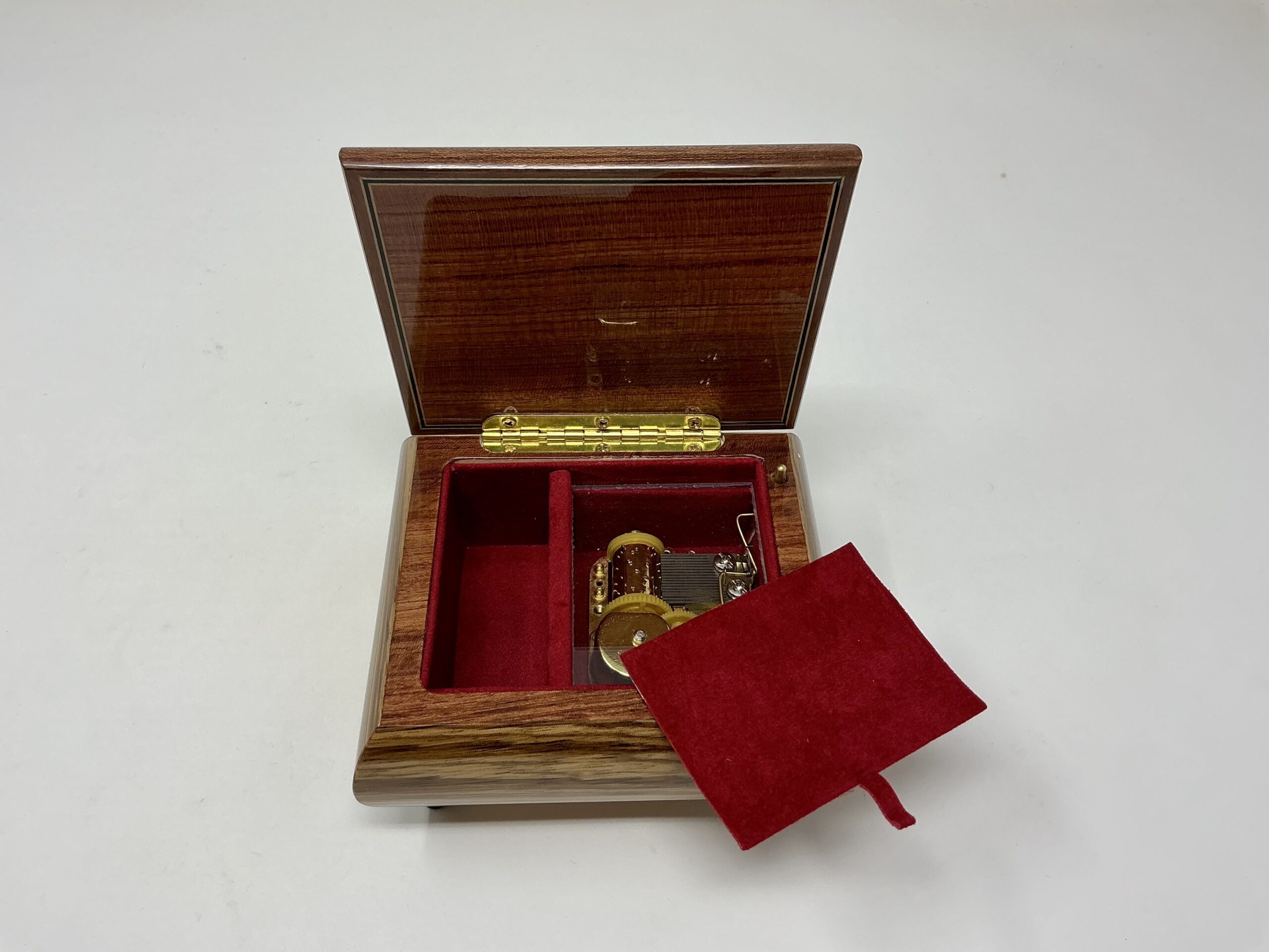 Questo portagioie è stato realizzato a mano con piccoli tasselli di legni differenti e selezionati.