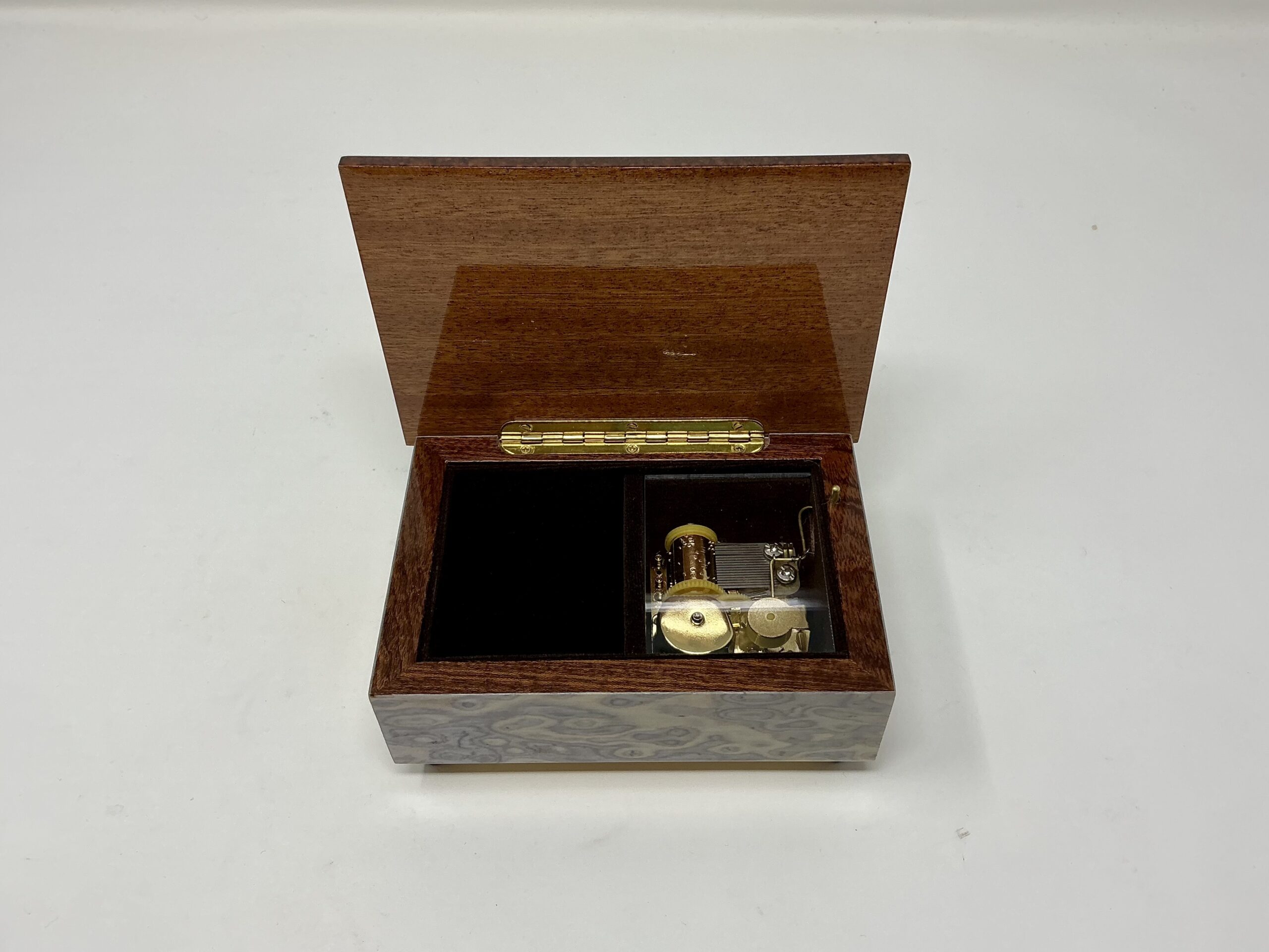 Questo portagioie è stato realizzato a mano con piccoli tasselli di legni differenti e selezionati.