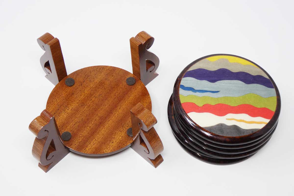 The coaster is made with mahogany wood, while the inlay on the top is made with different types of woods perforated by hand.